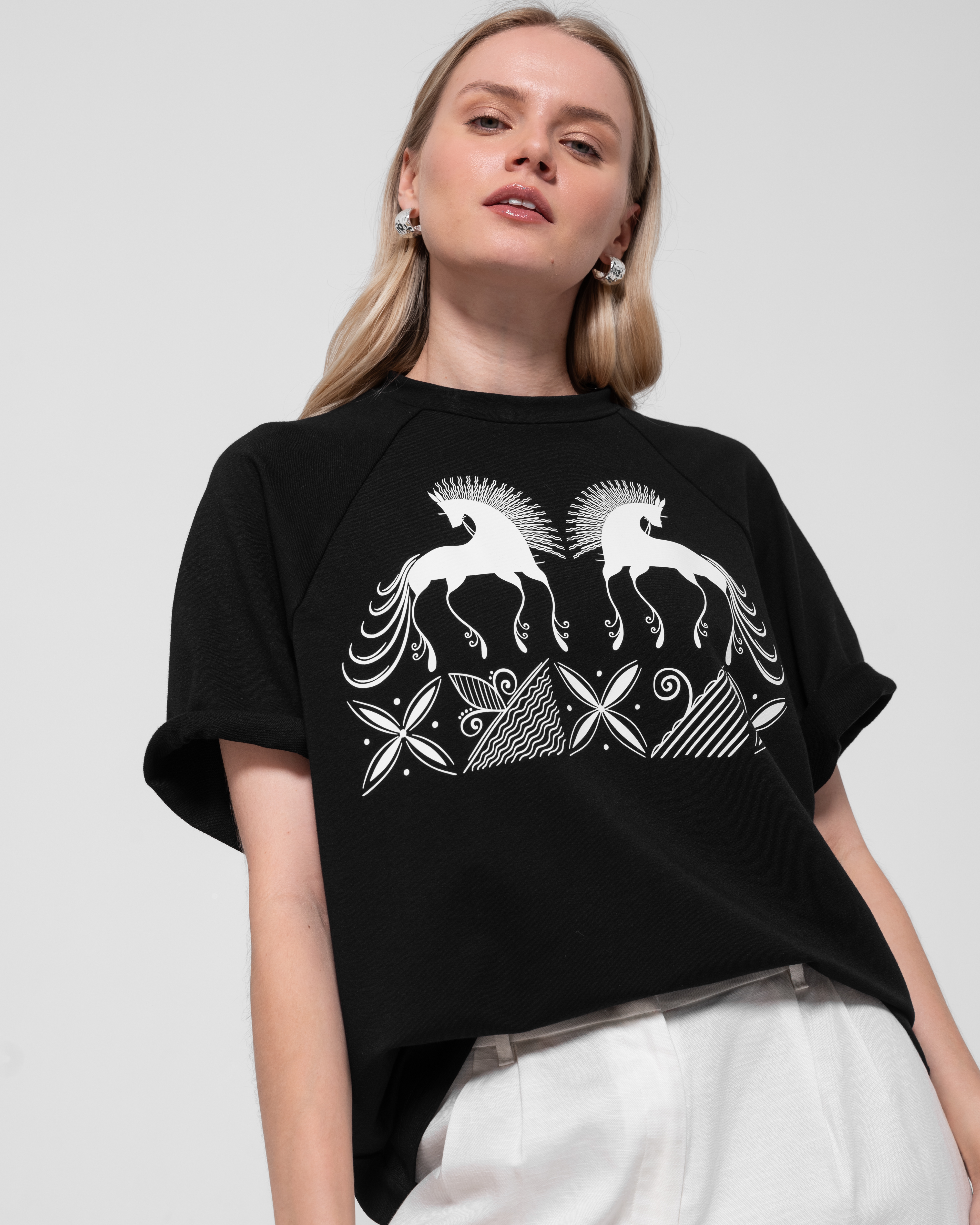 Конь в мезенской росписи – символ солнца, движения и жизненной силы. Эта толстовка – для активных и уверенных в себе.